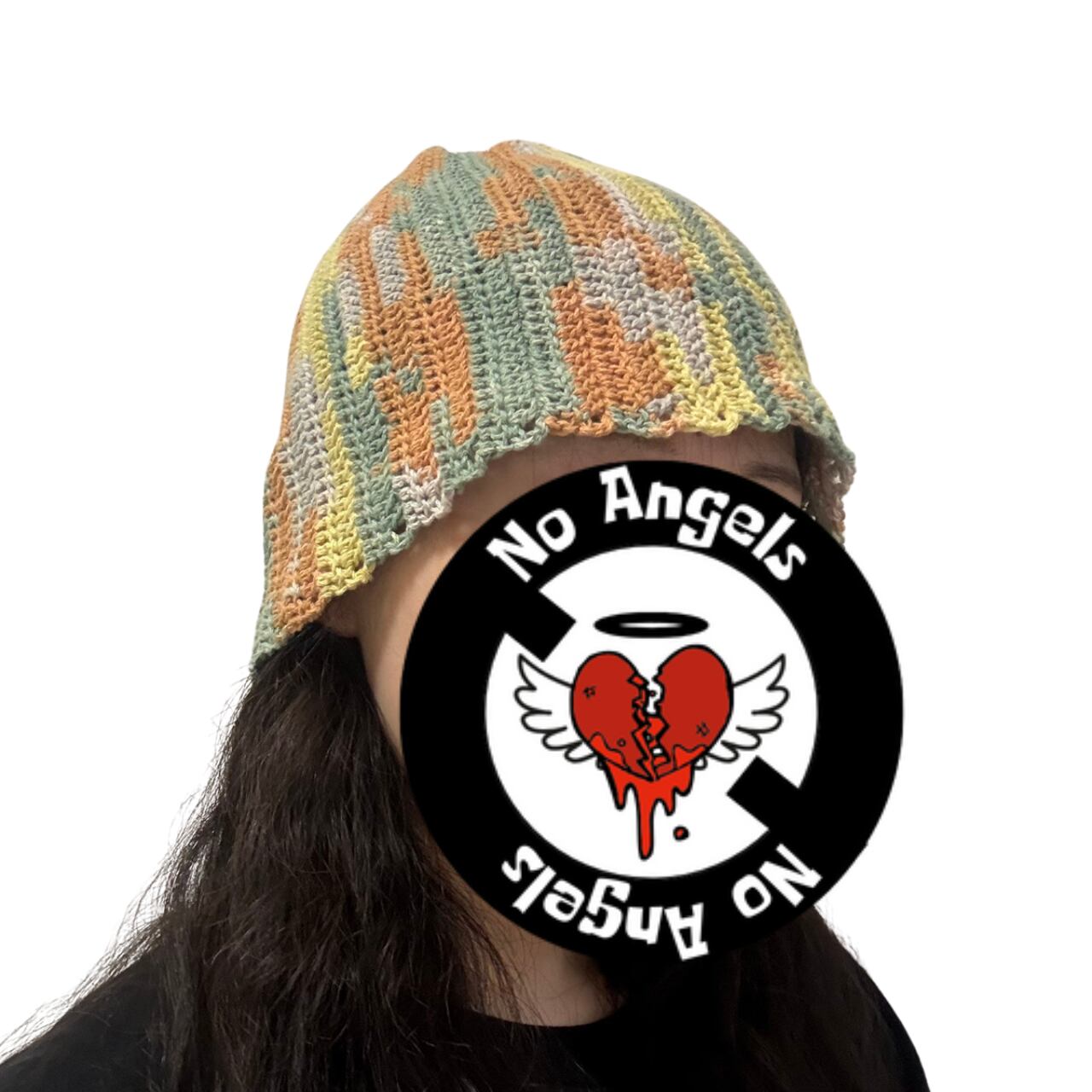 オレンジや緑をベースにした段染め毛糸で編んだチューリップハットです。