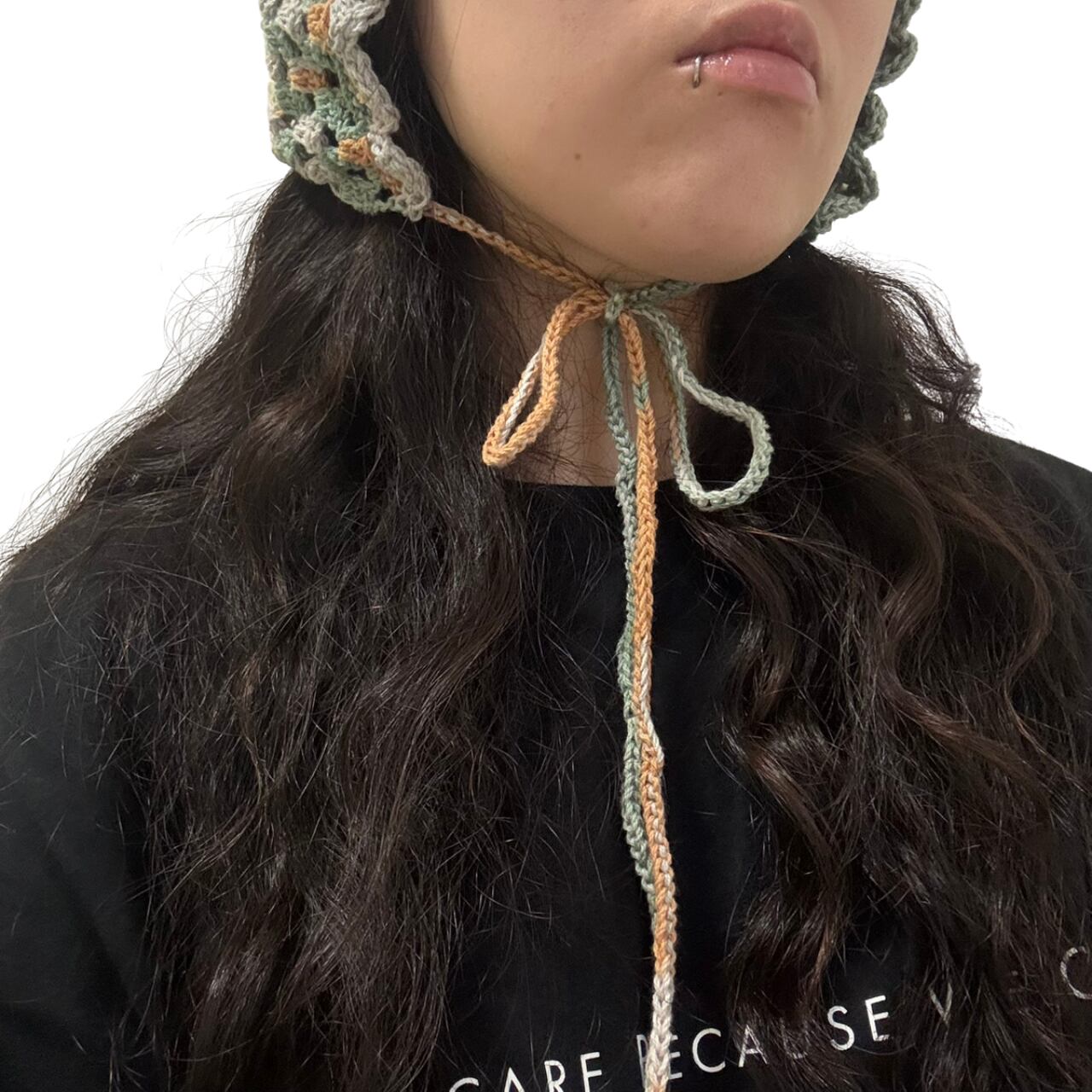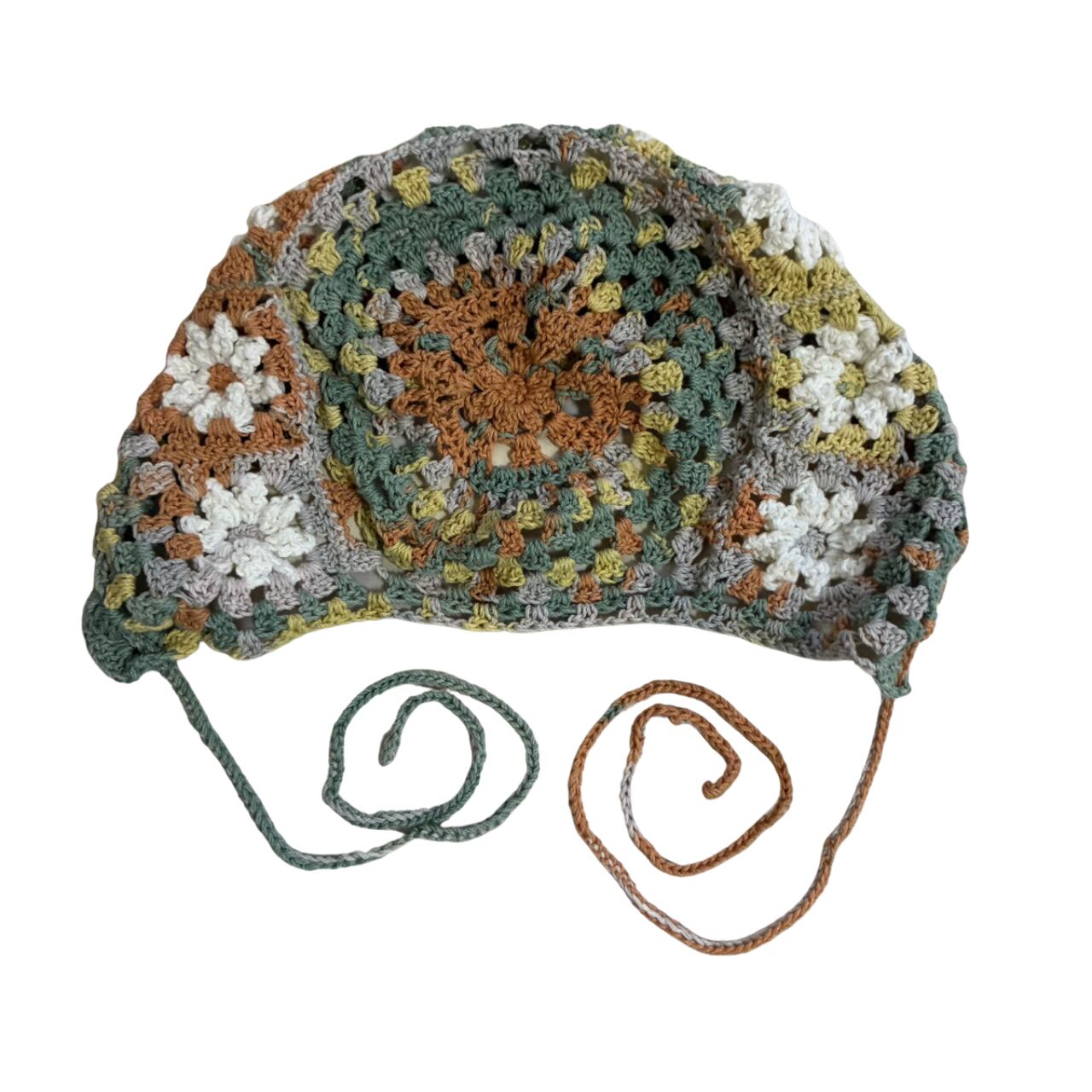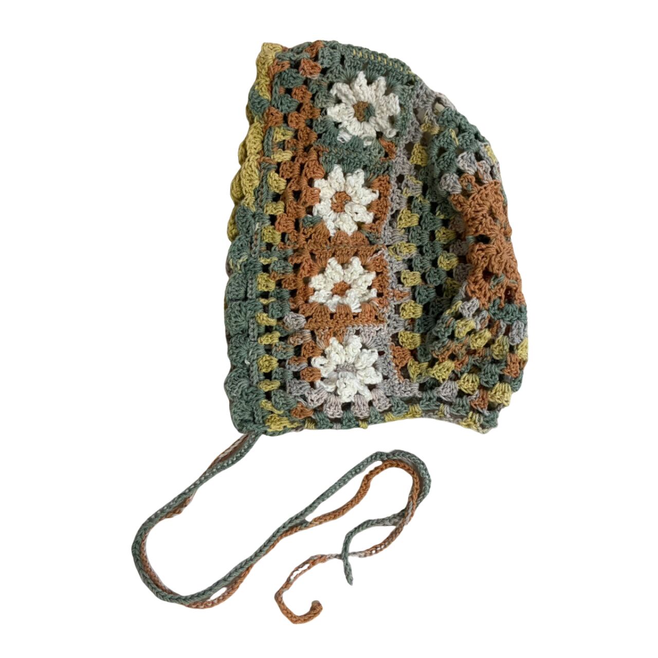 オレンジや黄緑の段染め毛糸をベースに、白いお花をあしらったボンネットです。