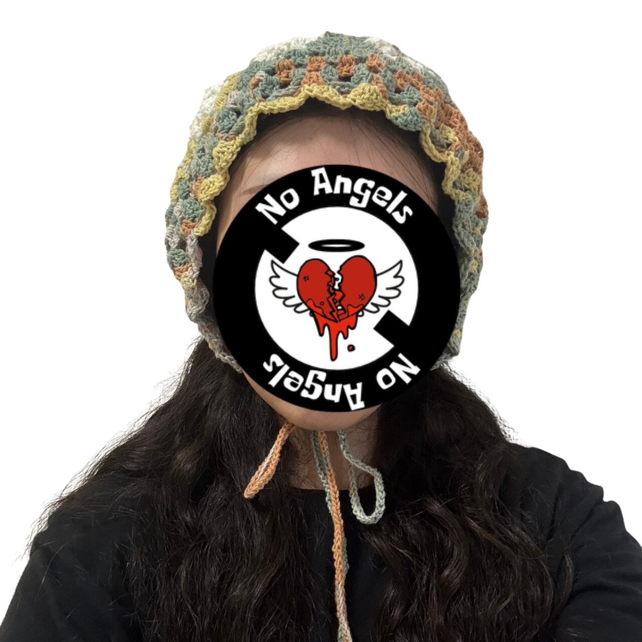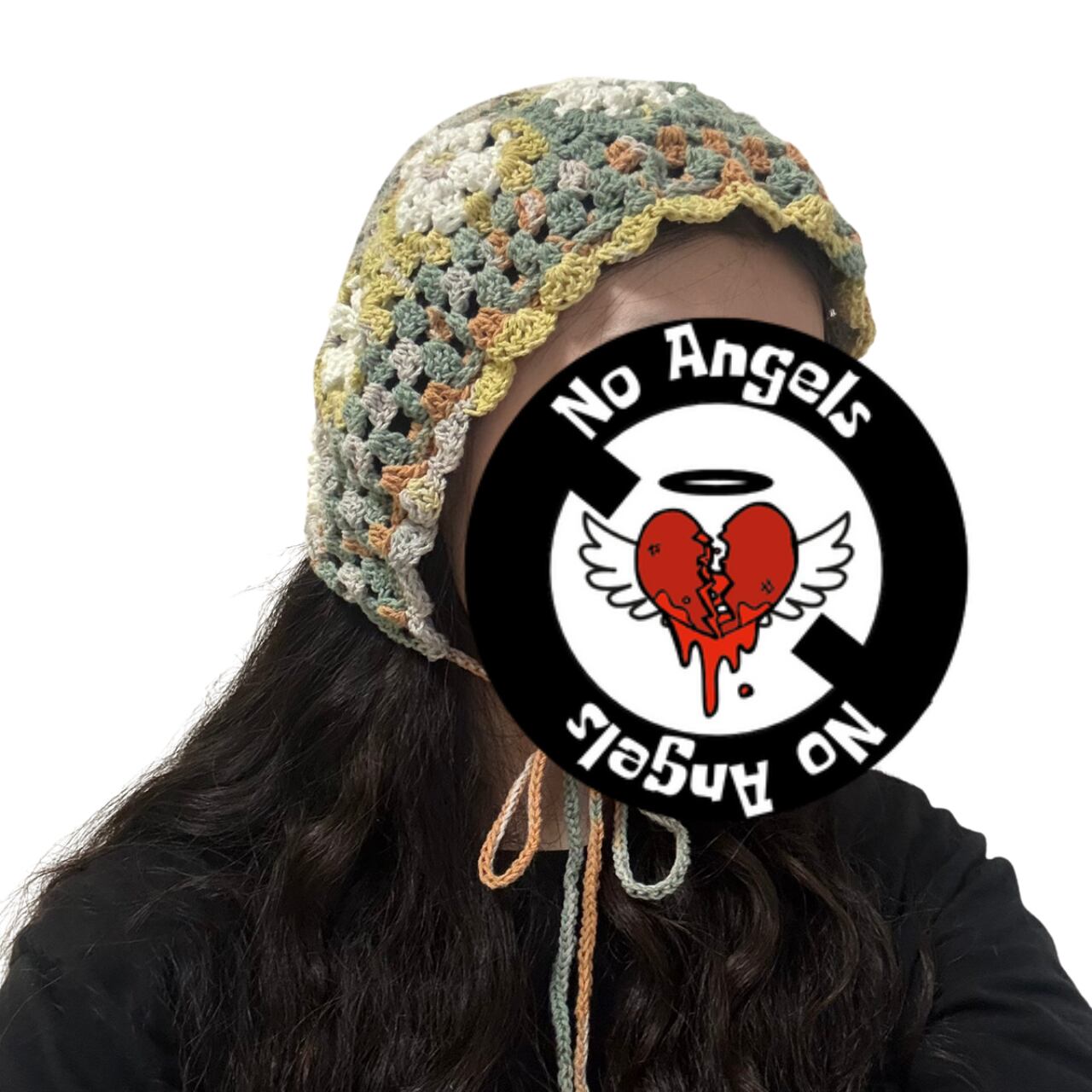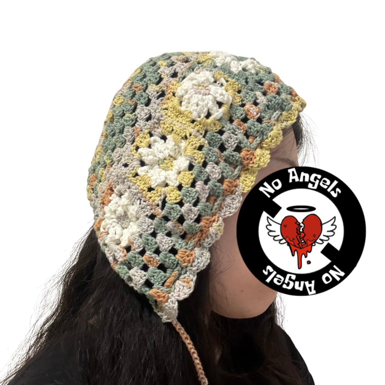 オレンジや黄緑の段染め毛糸をベースに、白いお花をあしらったボンネットです。