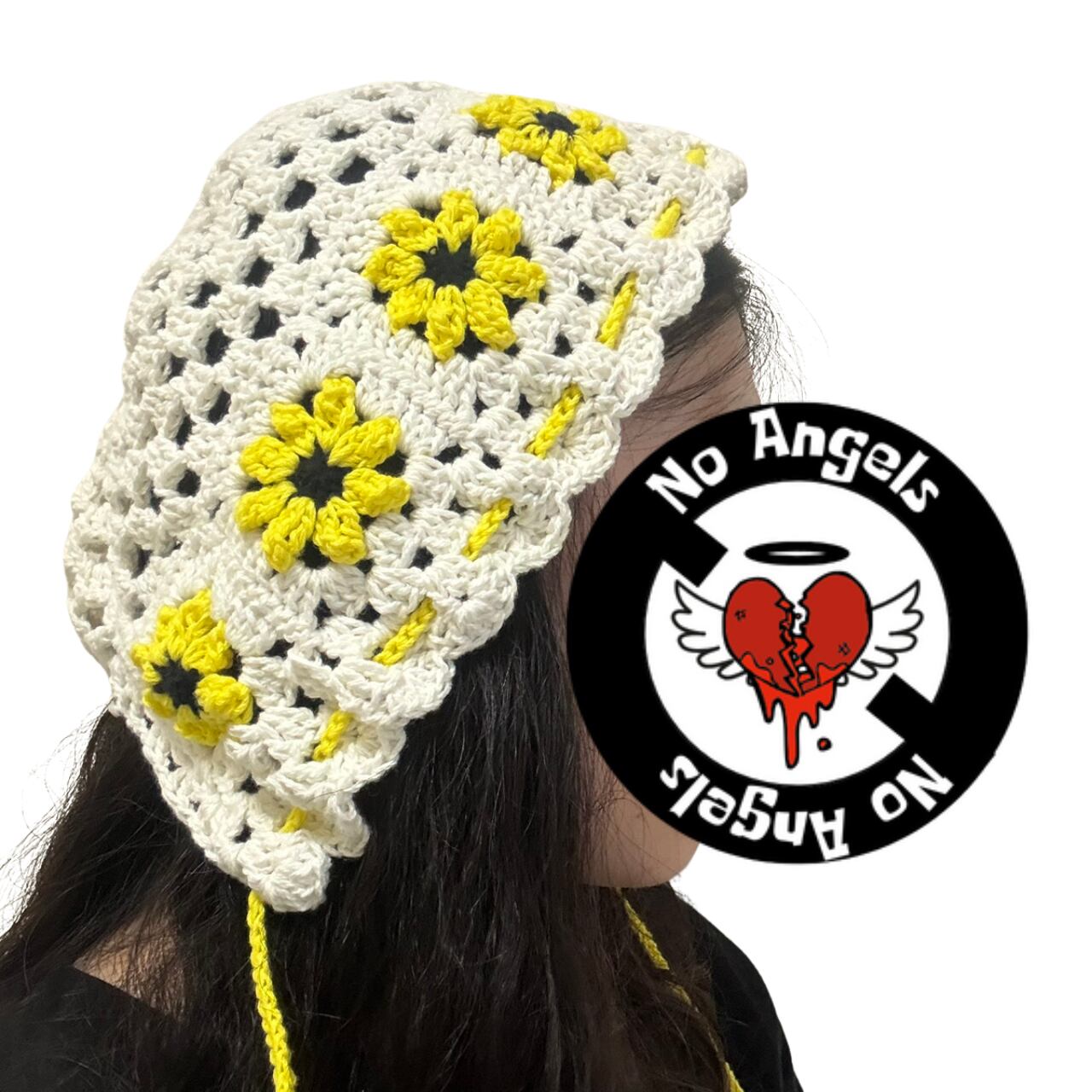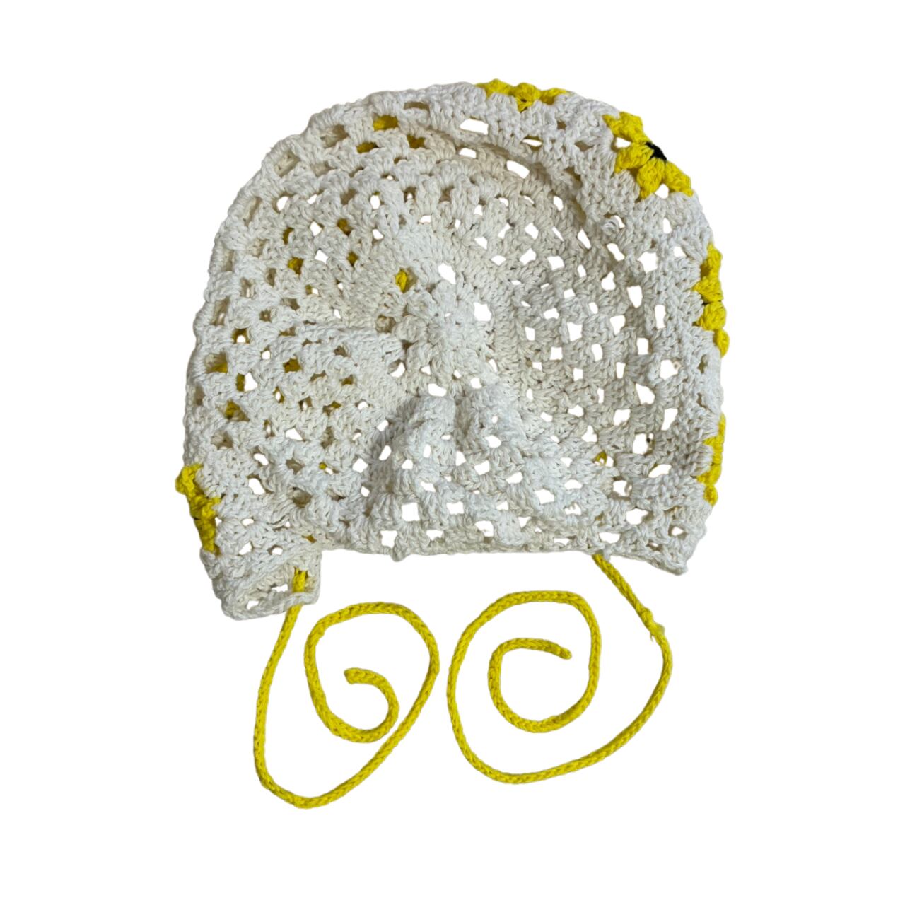 白の毛糸をベースに、黄色いひまわりをあしらったボンネットです。
